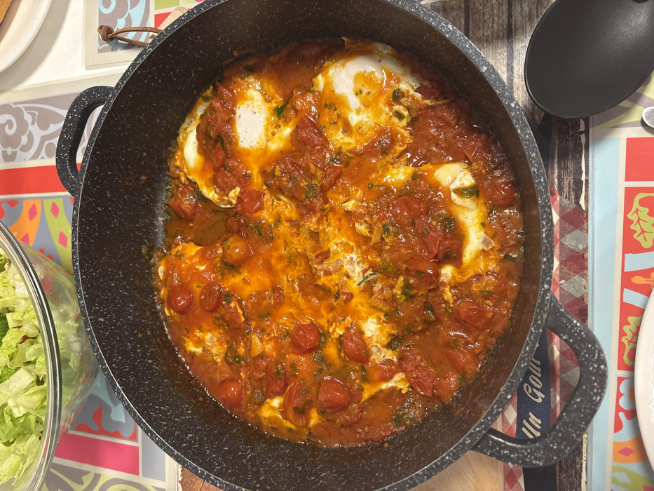 - "A top-down view of shakshuka, featuring poached eggs simmered in a tomato-based sauce with visible cherry tomatoes and green herbs, served in a large black pan with handles" by FM-4WJah1, licensed under CC BY 4.0