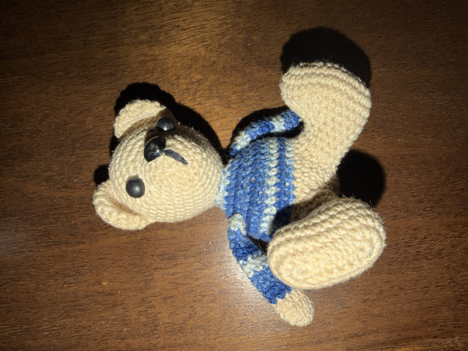 - "A crocheted teddy bear, predominantly light tan, rests on a wooden surface" by FM-sMVut2, licensed under CC BY 4.0