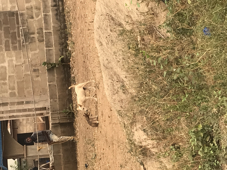 Two dogs, one light tan and the other brown, stand on a dusty patch of ground adjacent to a brick building. A man in a striped shirt stands nearby. The ground is uneven, with a sandy path leading into a dense area of dry, brown grass and green foliage. A blue plastic object rests among the plants. A rope structure extends from the side of the building towards the man.