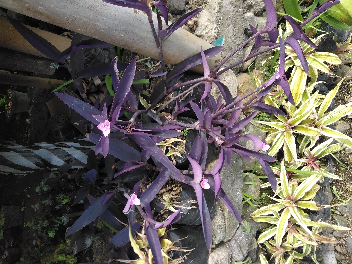 The image depicts an outdoor garden scene in El Rincón de Monagas, Venezuela. The primary subject is a cluster of *Tradescantia pallida* 'Purpurea' (Purple Heart plant) with dark purple, elongated leaves and small, three-petaled pink flowers. At least four distinct flowers are visible on trailing stems. Below this plant, several smaller plants with green and yellow variegated leaves, possibly a type of Bromeliad, are visible, many contained within black plastic nursery bags. The ground consists of soil, with irregular grey stones and patches of green grass or weeds. In the background on the left, a vertical post with black and white diagonal stripes is visible, alongside other potted plants in a darker area. On the right background, a light-colored, cylindrical post extends vertically. No individuals are present in the scene.