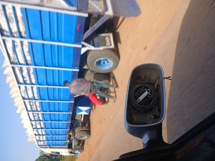 A roadside scene in Nandu, Nigeria, is captured from the interior of a vehicle, partially showing its damaged passenger-side mirror with the glass missing, exposing internal mechanisms and two dangling wires