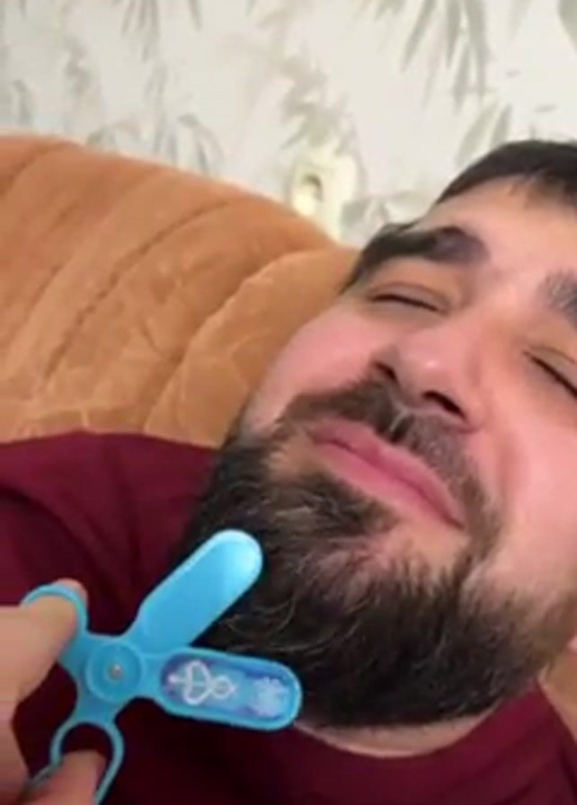 Here's a plain text description of the video: A man with a beard is lying on a couch. He is wearing a maroon shirt. His eyes are closed and he has a slight smile on his face. Someone is using blue plastic scissors to gently trim his beard. The background shows a wall with a light floral pattern and an electrical outlet. The couch is light brown. Music is playing in the background.