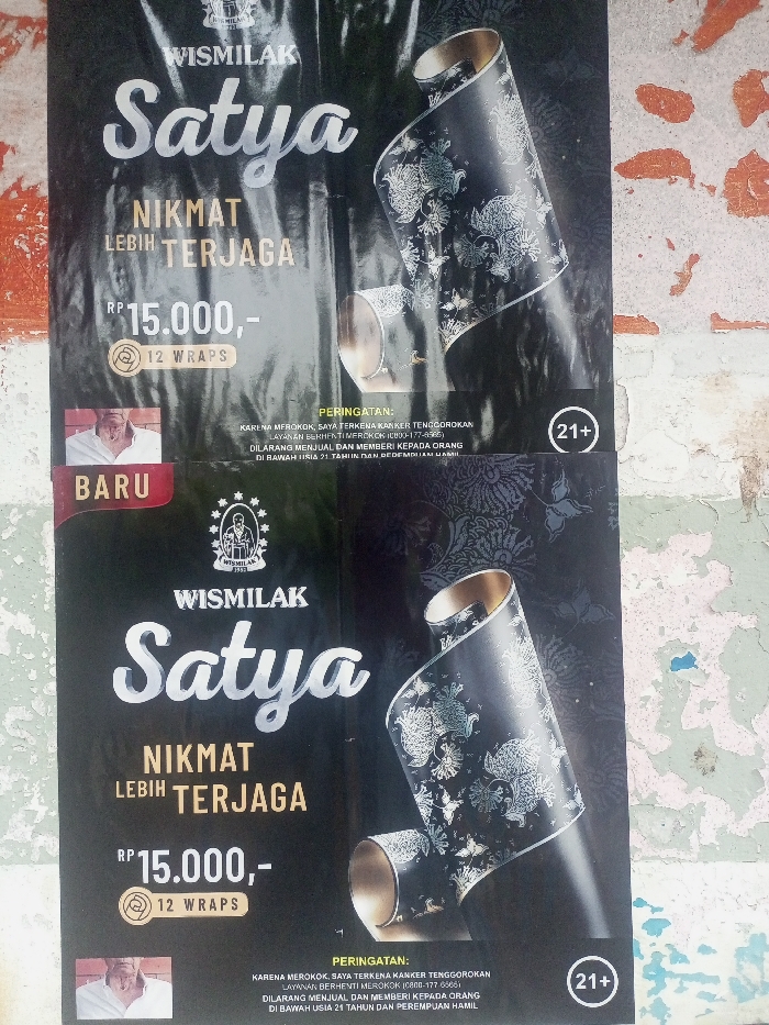 - "The image displays two identical, slightly overlapping promotional posters for "WISMILAK Satya" products, affixed to a weathered wall in Zee Pin Kone, Myanmar" by FM-uQLO53, licensed under CC BY 4.0