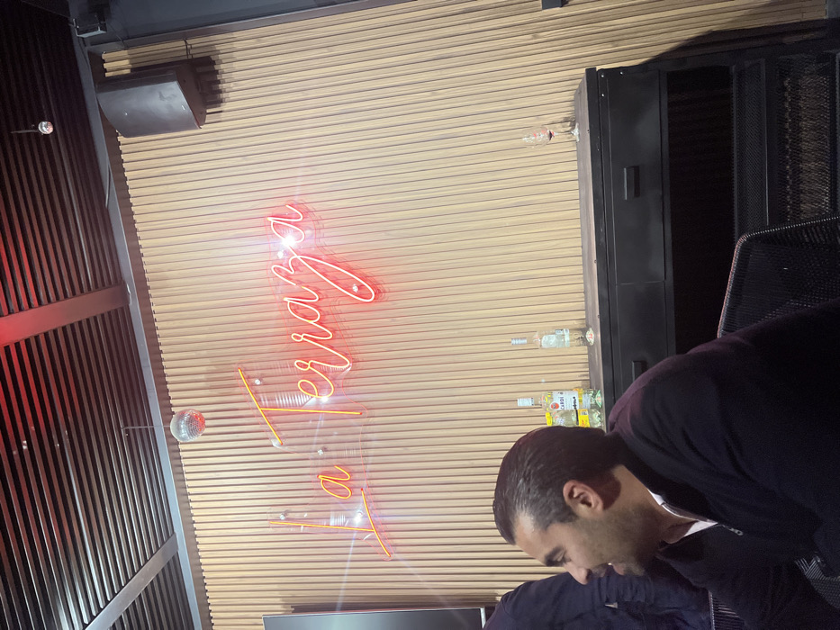 A tilted view shows a man in a dark blazer looking downward, with a hint of a white shirt beneath. Behind him is a light brown wood paneled wall. On the wall is a neon sign that reads "La Terraza" in a cursive font. There are also multiple liquor bottles visible on the wall. To the left is a structure with slats of metal and a disco ball. A speaker is mounted in the upper left.