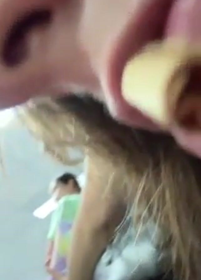 person holding a rolled wafer cookie in their mouth. The camera pans down and shows a waiting area in what appears to be an airport or other travel terminal. People are sitting in rows of black chairs. Signs are visible with the words "TOURIST" and "ONE STOP." Passengers with luggage are scattered around the area.