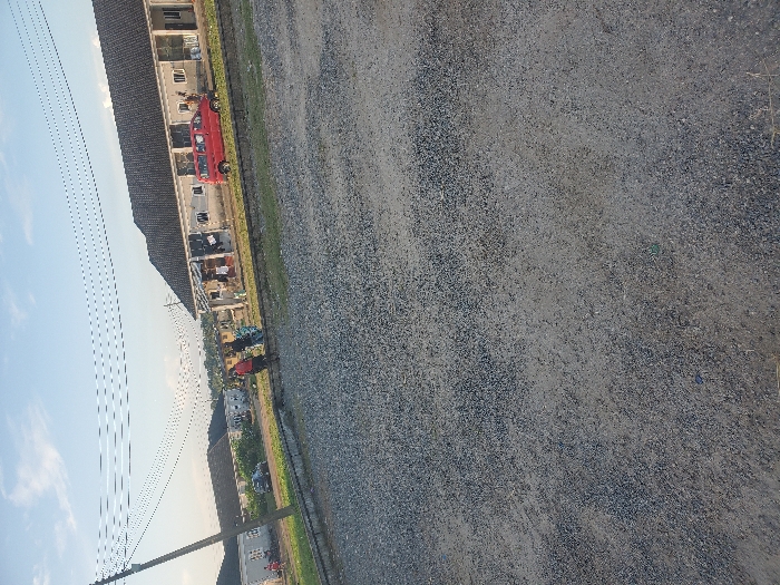 The image displays an outdoor scene in Epe, Nigeria, under a partly cloudy sky. The immediate foreground is an unpaved area composed of gravel and dirt. A low concrete curb or barrier separates this from a narrow strip of grass. Beyond the grass, a road runs parallel to a long, single-story building with a dark gabled roof and light-colored walls, featuring multiple windows. Laundry is visible hanging outside one section of this building. A red minivan or small bus is parked on the roadside in front of the building. Several individuals are present near the vehicle and building, including at least three discernible figures, one wearing a prominent red shirt. To the left, a utility pole supports multiple overhead electrical wires that span across the upper portion of the frame. Further to the left, another low-rise building with a dark roof is visible. The distant background shows a line of green vegetation or hills beneath the horizon.