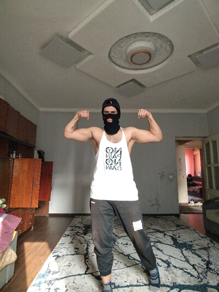 The image displays an indoor residential scene located in the city of Unknown, Unknown. A male subject stands centrally in the foreground, facing the camera and flexing both biceps. He is wearing a black knitted balaclava that obscures his face except for the eyes, nose, and mouth area, with a dark, beard-like extension below the mouth. A dark baseball cap with an orange "NY" logo is worn backward over the balaclava. He wears a white sleeveless tank top printed with multiple instances of "NO PAIN NO GAIN" in dark letters, dark grey sweatpants with a white rectangular patch on the left thigh, and dark blue and grey striped ankle socks. The room features light grey walls and a white ceiling with decorative moldings, including a central circular light fixture and two square recessed panels. The floor is covered by a large area rug with an abstract pattern of dark blue lines on a light background, with wooden floorboards visible around its edges. To the left, a multi-section wooden cabinet unit is positioned against the wall. A light-colored sofa or armchair is partially visible on the far right. An open doorway on the right leads to an adjacent room, where a second individual is partially visible on a bed, and a black and white cat rests on the floor near the doorway. Orange curtains are visible in the background room. Natural light enters the foreground room from an unobserved source, casting shadows.