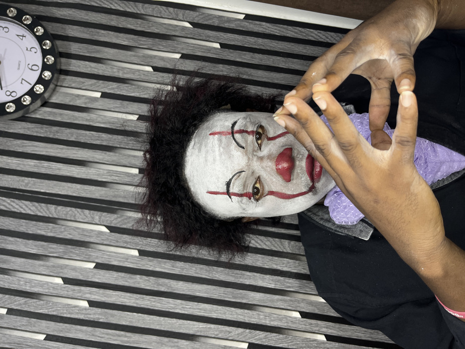 The image displays an individual centrally framed, adorned with white and red clown makeup resembling the "Pennywise" character