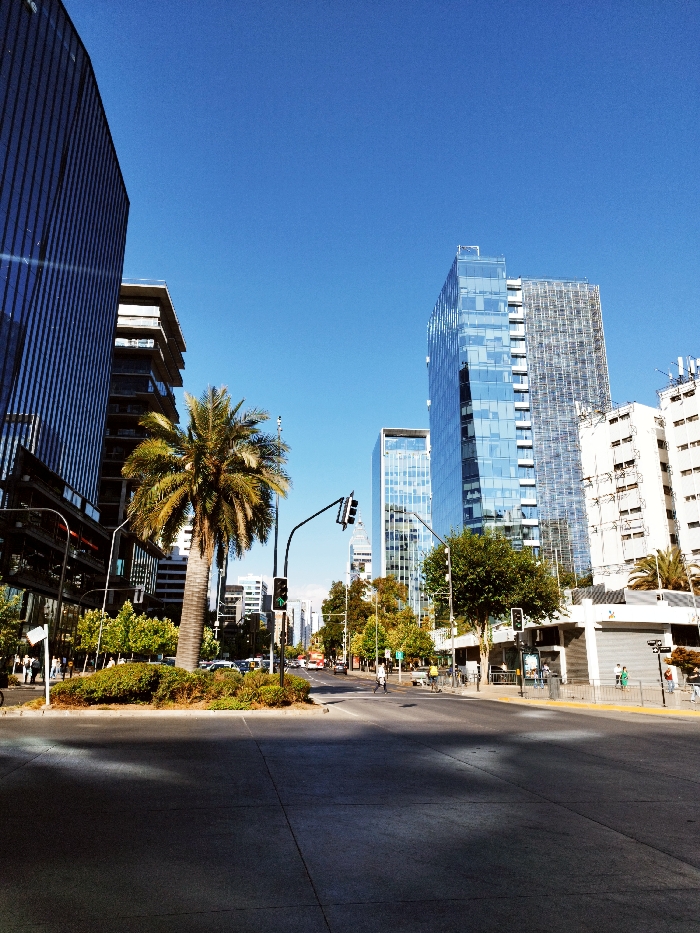 A city street scene under a bright blue sky. Modern skyscrapers with glass facades dominate the skyline, interspersed with older, white buildings. A tall palm tree stands on a median, surrounded by green bushes. Traffic lights are visible along the street. Pedestrians and cars can be seen in the distance. The road is wide and mostly clear of traffic, with shadows stretching across the pavement.