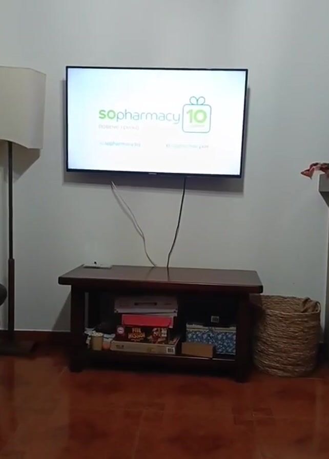living room with a television mounted on the wall. The television displays an advertisement for Kaufland featuring a woman, a child, and a dog in a laundry room setting. Below the television is a dark wooden table with two shelves. The top shelf is occupied by a remote control and various other objects. The bottom shelf contains board games, boxes, and other items. Next to the table is a large wicker basket. To the left of the table is a floor lamp with a light-colored shade. The floor is tiled in a reddish-brown color. The walls of the room are white.