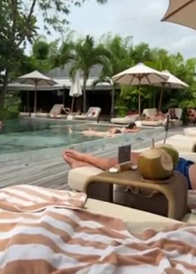 relaxing scene at a tropical resort pool. Several people are lounging around the pool, some on lounge chairs and others floating in the water. The pool is surrounded by lush greenery, including palm trees and other tropical plants. White umbrellas provide shade for the lounge chairs. A person is resting on a lounge chair in the foreground, with a striped towel and a small table next to them. On the table, there's a fresh coconut drink and a pair of AirPods. The camera focuses on the people in the pool who are floating on their backs, enjoying the calm water. The overall atmosphere is serene and peaceful.
