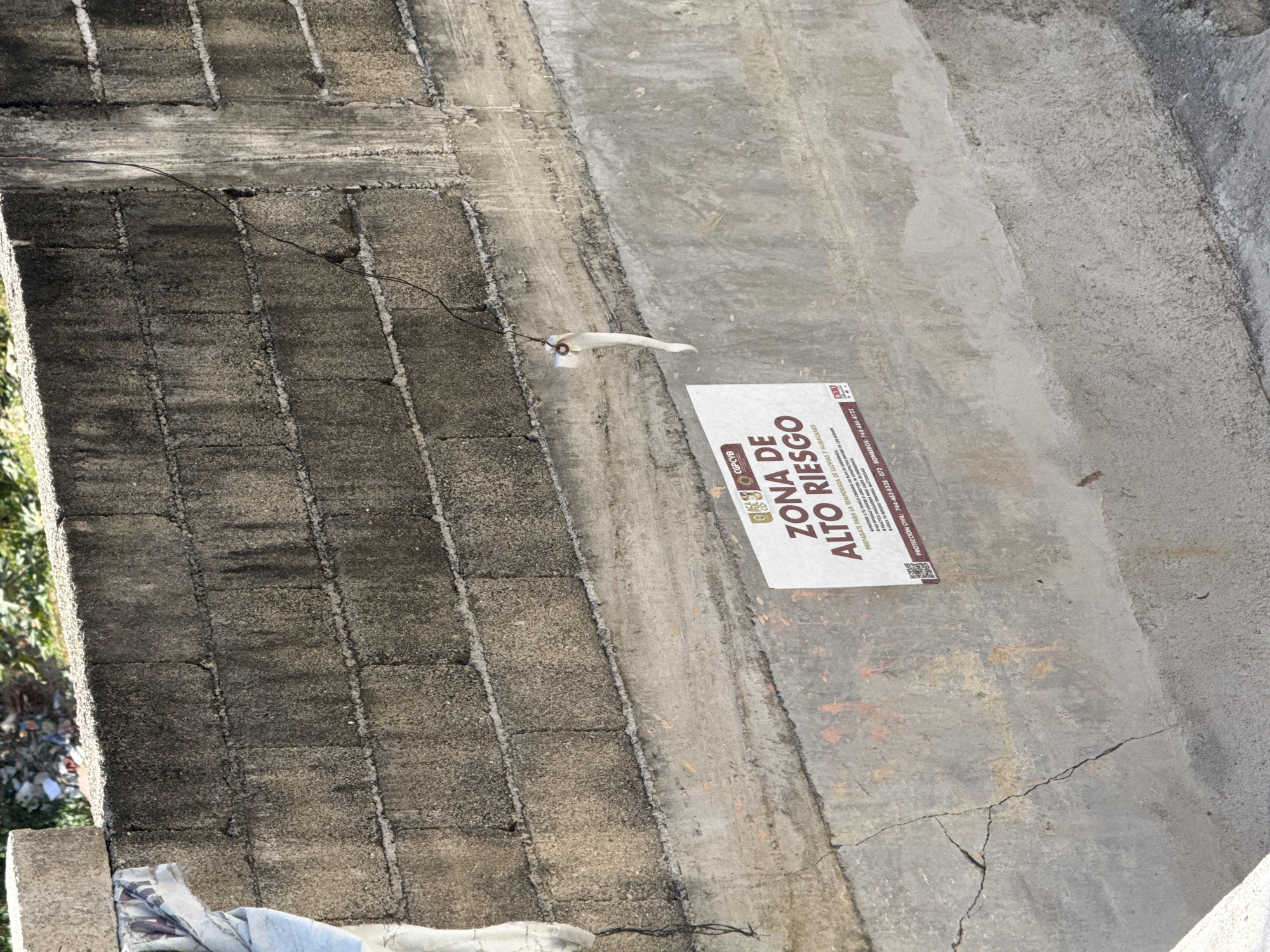 The image depicts a worn concrete staircase or embankment, with a warning sign affixed to it. The sign reads "ZONA DE ALTO RIESGO" (High-Risk Zone) and provides safety instructions in Spanish for the rainy and hurricane season, including contact information for Protección Civil and Bomberos. The setting suggests an urban or semi-urban area in Acapulco, Mexico. The scene includes elements of wear and potential risk.