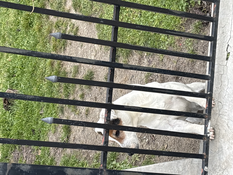The image depicts an outdoor scene in Benkovski, Bulgaria. A white dog with brown markings around its right eye and on the right side of its head is seated behind a black metal fence. The dog faces left, with its head slightly turned, and its front paws are visible resting on the lower horizontal bar of the fence. The fence is composed of vertical black metal bars, some topped with conical silver-colored finials, and a lower horizontal black bar. Behind the fence, the ground is covered with a mix of green grass and exposed soil patches. A dark-feathered bird is partially visible, camouflaged within the grass in the upper background. In the immediate foreground, a cracked concrete surface is present beneath the fence.