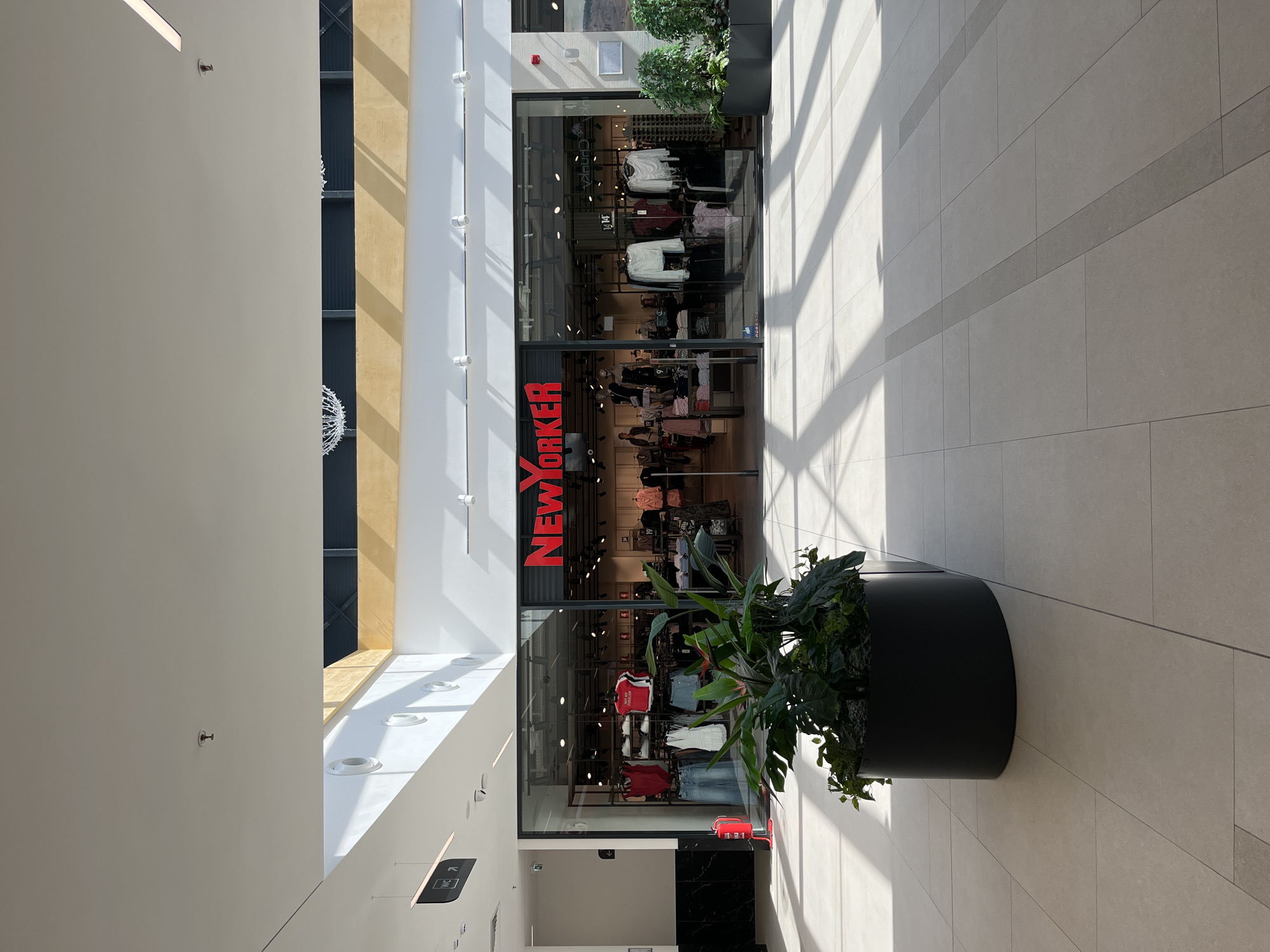 This image presents a frontal view of a "NEW YORKER" clothing store located within the TQ Plaza shopping mall in Budva, Montenegro. The store features a large glass storefront with double entry doors, above which a red, illuminated "NEW YORKER" sign is prominently displayed. Inside the store, visible through the glass, are clothing racks and mannequins showcasing various apparel items, including red tops, denim jeans, white dresses, and light-colored blouses or sweaters. In the immediate foreground, a large, dark grey cylindrical planter contains dense green tropical foliage, including a plant with visible red-orange blossoms, situated on the tiled floor. To the right of the store entrance, a rectangular dark planter also holds green plants. The mall floor consists of light grey square and rectangular tiles, interspersed with darker grey tile strips. Overhead skylights cast pronounced rectangular and linear shadows across the floor from the upper structure. The mall corridor features a high, light-colored ceiling equipped with recessed lighting, fire sprinkler heads, and exposed structural elements visible through the skylights. On the left side, a black suspended sign with a white "WC" symbol and an arrow indicates the direction to restrooms. A red fire extinguisher is mounted on a section of black marble paneling adjacent to the left side of the store's entrance. No individuals are visible within the frame, and no specific actions or interactions are depicted. The overall environment is modern, clean, and well-lit.