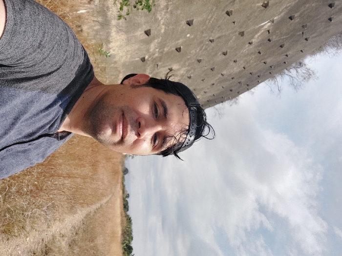 A person wearing a gray shirt and black hat poses outdoors. To their left, golden grass and a path fade into the distance under a sky with white clouds. Behind them, a concrete structure with regularly spaced geometric shapes extends upward, with vegetation visible at the top.