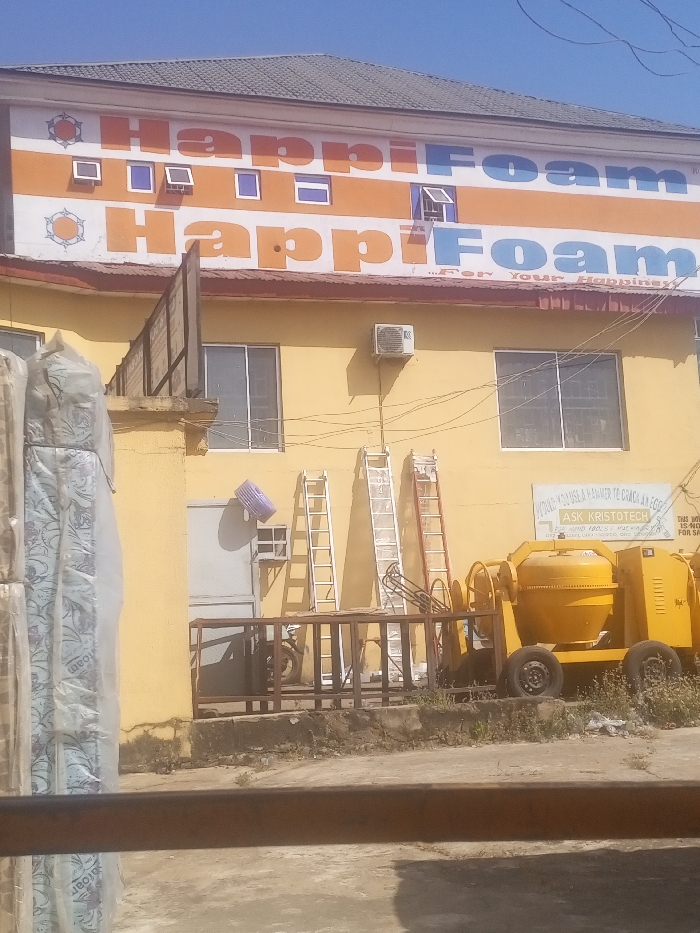 A daytime outdoor scene depicts a two-story commercial building in the city of Unknown, Unknown. The upper facade of the building features a white surface with large orange and blue lettering spelling "HappiFoam" twice, with smaller text below reading "...For Your Happiness." Multiple small, square windows are set into this upper facade, some of which are open. The building's roof is grey and pitched. The lower floor of the building is painted yellow. An air conditioning unit is mounted on the yellow wall. Two large windows, one a sliding glass door, are visible on this floor. A grey utility door is present on the left side of the lower floor. Black electrical wires run horizontally across the yellow wall. A purple plastic bucket is inverted and hanging on the wall to the left of the utility door. In the mid-ground, three extension ladders are propped against the yellow wall; two are silver/white, and one has red accents. To the right, a large yellow concrete mixer with two wheels is parked. A white sign with blue text, partially visible, advertises "KRISTOTECH" near the mixer. On the far left, a stack of mattresses wrapped in clear plastic and patterned fabric is visible. A dark metal railing or fence extends across the foreground, with a partially visible dark object, possibly a motorcycle, behind it on the left. The ground consists of dirt and concrete, with minimal vegetation. No people are visible in the scene. The lighting suggests a clear, sunny day.