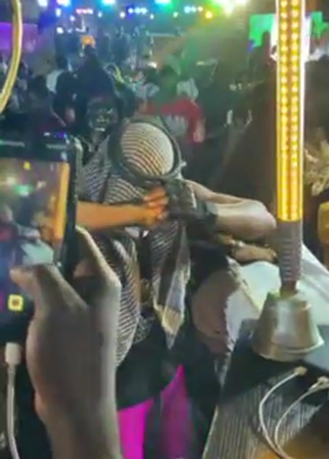person dancing in a crowded outdoor setting, likely a party or event at night. The dancer wears a black tank top, bright pink pants, a white Guy Fawkes mask, and a head covering resembling a keffiyeh. They are surrounded by a large group of people, many of whom are dressed casually. The dancer is positioned near a bar or table, on which a lighted, decorative piece resembling a sword is placed, alongside a bell and a bottle of alcohol. A person is filming the dancer with a smartphone, the screen capturing the action. The background features colored stage lighting and hints of buildings. The overall atmosphere suggests a lively and festive celebration.