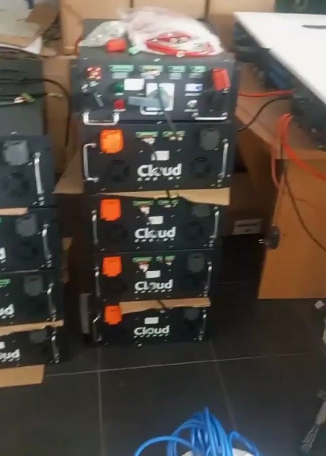 n indoor space with stacks of Cloud Energy batteries. There are two stacks of the battery units, one of which is four units high. An additional unit is placed atop the four units on the second stack. Adjacent to the second stack, on top of a wooden desk, are two inverters and wiring. Behind the battery stacks are several stacked cardboard boxes. A blue cable is on the floor in front of the stacks, and a green scooter is visible in the background.