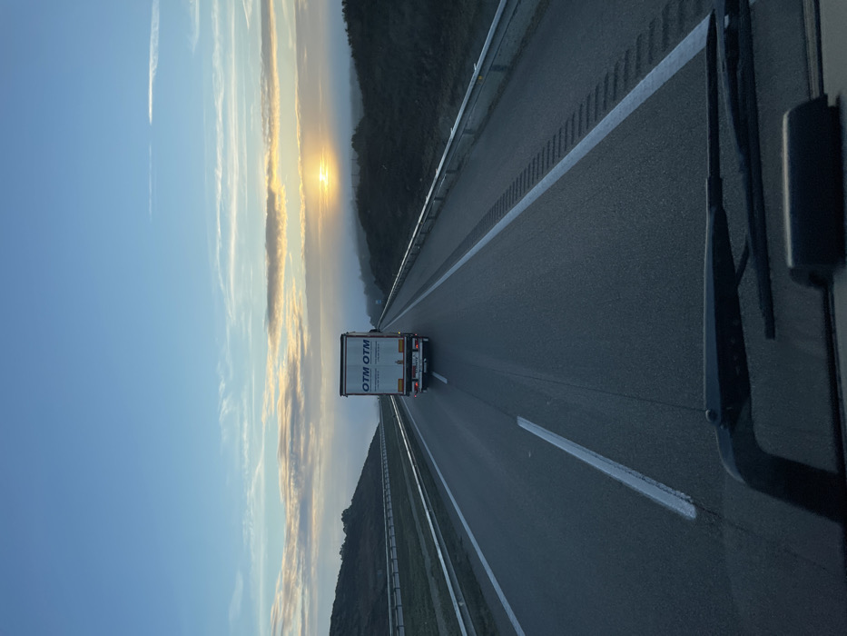 A sunny highway stretches into the distance, leading toward the horizon with a bright sun and hazy clouds. A white truck with the letters "OTM" displayed on its back travels in the same direction. The road features white lane markings. The view is captured from inside a vehicle, with a portion of the windshield wiper and side mirror visible. Trees line the side of the road.