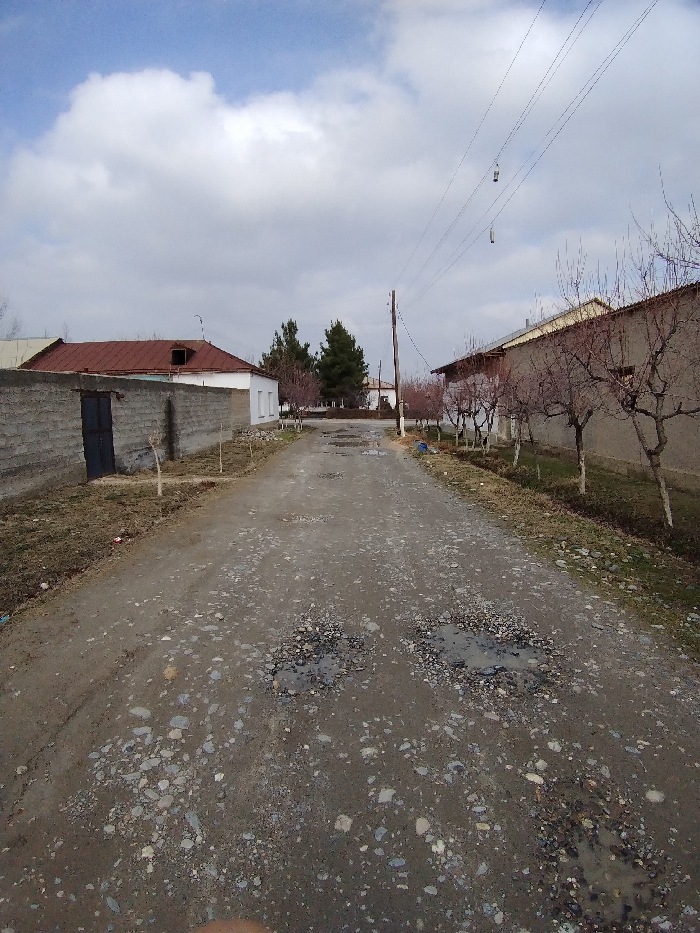 The image displays an unpaved, gravel and dirt road in Beshbola, Uzbekistan, under a partly cloudy sky