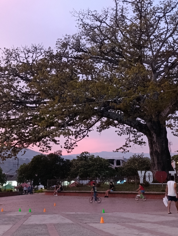This image captures a public square or park in Timaná, Colombia, at dusk