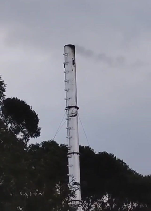 tall, silver chimney emitting smoke against a cloudy sky. The chimney is surrounded by trees. The chimney has a ladder attached to it, and is stabilized by cables.