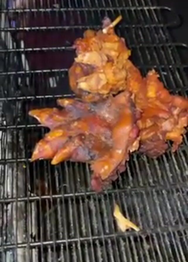 metal grill holding several cooked pieces of animal meat. A person with brown skin reaches into the grill and moves the food around. A green object is briefly visible in the background. The person's hand appears to be moving the meat around, presumably to ensure even cooking or to remove it from the grill.