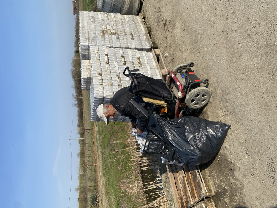An elderly male, with a grey beard and wearing a white baseball cap, dark jacket, and dark trousers, is seated in a maroon and black electric wheelchair. He is positioned on unpaved ground, actively sorting empty aluminum cans into a black plastic crate on his lap. A large, full black plastic trash bag rests on the ground to his left, leaning against the wheelchair and a stack of wooden pallets. In the mid-ground, to the man's right, multiple large stacks of uniformly packaged items, possibly bundles of compressed materials or recyclables, are visible on wooden pallets. A narrow, water-filled ditch with dry reeds runs horizontally behind the man's left side. Beyond the ditch lies an open, grassy field with scattered bare trees and shrubs extending to the horizon under a clear blue sky. A large succulent plant is visible in the far left mid-ground. The scene is located outdoors in the Palilula Urban Municipality, Serbia.