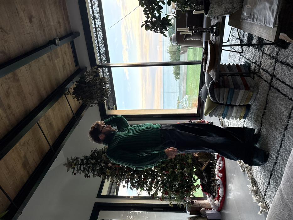 A man in a green sweater and dark pants reclines against a window, looking out at a horizon with water and sky. Beside him stands a decorated Christmas tree. The room features exposed wooden beams and a textured rug. The orientation of the photo is sideways, giving a unique perspective of the interior space.