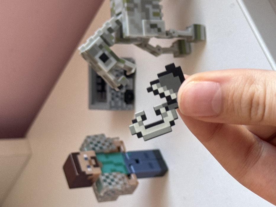 A close-up, high-angle photograph captures a human hand holding a pixelated gray and black pickaxe-shaped toy in the foreground. The hand, visible from the knuckles to the fingertips, has neatly trimmed fingernails. In the background, resting on a flat, white surface, are three additional Minecraft-themed toys. To the left, a "Steve" character figure stands upright, featuring brown block-like hair, blue eyes, a light blue shirt, and dark blue pants. To the right of the Steve figure, a gray block-like structure, possibly a chest or furnace, is present. Further to the right, a skeleton horse figure, constructed from light gray and white blocks with minimal green accents, is positioned on all fours. The background beyond the white surface is out of focus, showing a light beige wall that transitions diagonally into a darker, reddish-pink surface. The specific location within Pleven, Bulgaria, or any other geographical detail, is not discernible from the visual evidence.