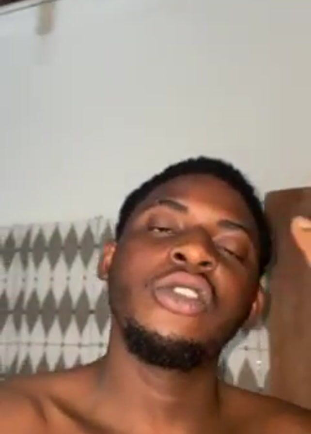 A shirtless, light-skinned man with dark hair and a beard is looking into the camera. He gestures downwards with one hand, then raises it to his face and moves it around. The background includes a wall with a pattern of grey diamond shapes, a ceiling with a similar pattern, and a wooden door. He looks down, then back up at the camera, putting his hands behind his head and adjusting his hair.