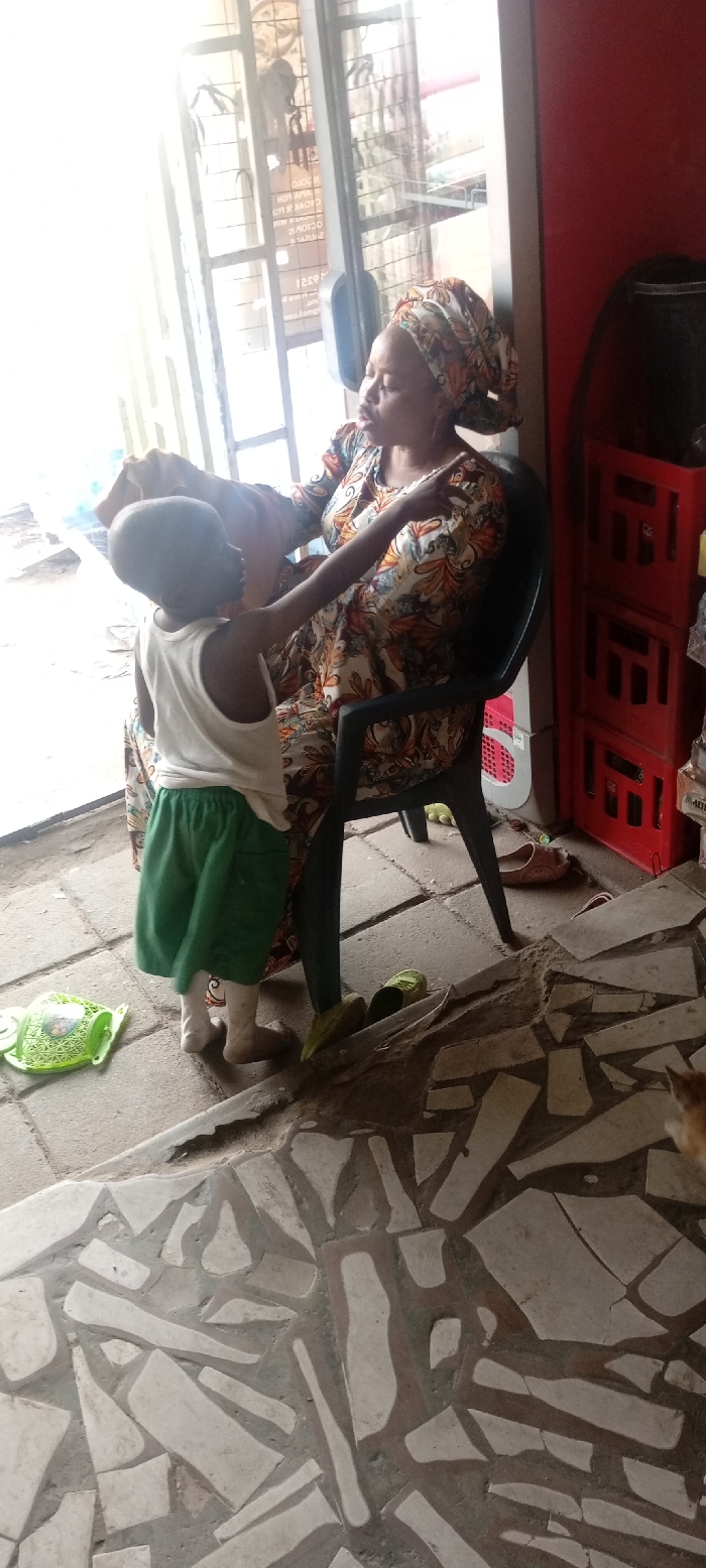 An adult female and a young child are observed in a transitional space within Kwachiri, Nigeria. The female is seated on a black plastic chair, wearing a floral patterned dress and a matching headwrap. Her head is turned towards her left, and her mouth is open. A young, barefoot child, wearing a white tank top and green shorts, stands facing the seated woman. The child's right arm is extended towards the woman's shoulder area. The floor in the foreground is composed of irregularly shaped light-colored mosaic tiles set in a darker matrix. Behind the seated woman, against a red-painted wall section, are stacked red plastic crates, some containing bottles. A pair of brown slip-on shoes rests near the chair's base, and a pair of green slip-on sandals are under the chair. To the left of the child, a green plastic basket lies on a paved surface. The background consists of a brightly lit exterior seen through a glass and metal-framed doorway.