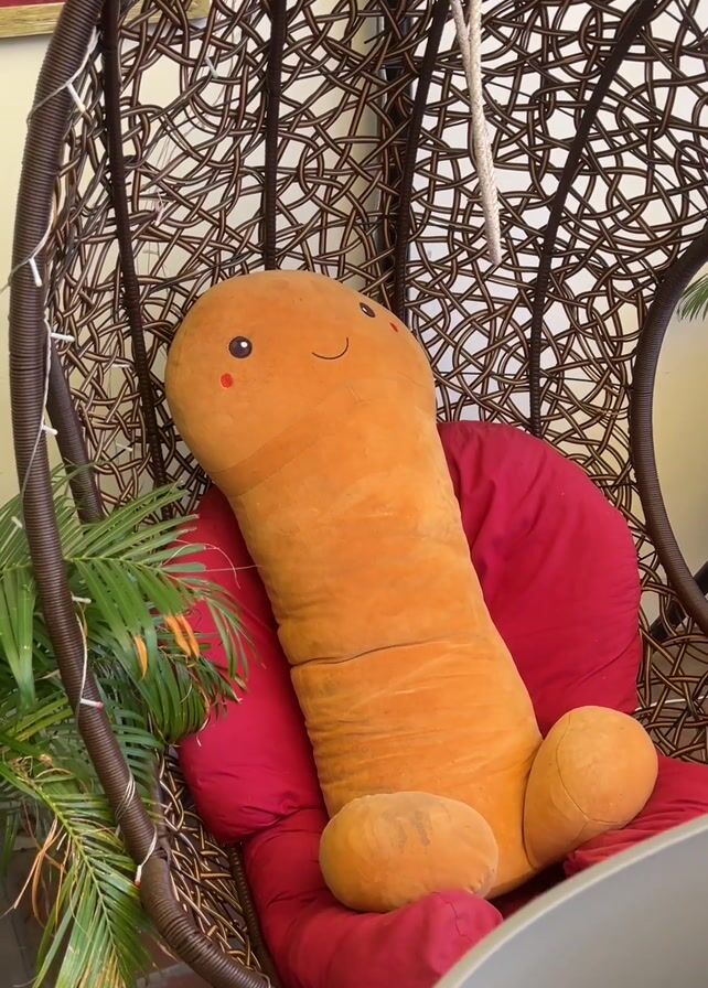 A large, phallic-shaped orange plush toy is seated on a red cushion inside a hanging wicker chair