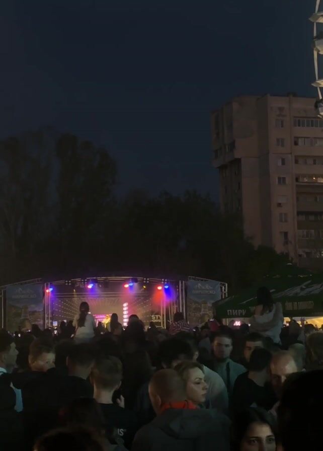 A large crowd is gathered in an open space at night, facing a brightly lit stage. The stage features two banners with logos. Silhouetted figures are visible on stage, possibly performing. A few people in the audience have others on their shoulders. In the background, there are trees, a tall building, and what appears to be a booth with the word "ПИPКО" on it.
