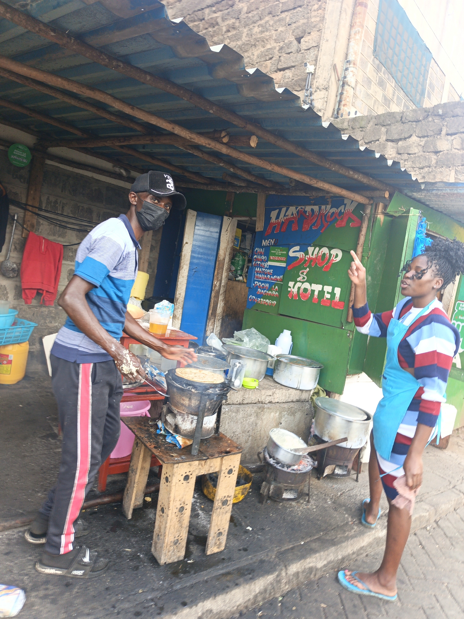 A medium shot captures two individuals outside a small business. On the left, a man wearing a black baseball cap, a blue and gray striped shirt, black pants with a red stripe, and black shoes is cooking on a charcoal stove placed on a small wooden stool. He wears a black mask and has a hand covered in dough. To the right, a woman in a blue apron, a striped long-sleeved shirt, and blue sandals points upwards, possibly indicating an item on the menu displayed behind her. The business, painted in green and blue, advertises "SHOP & HOTEL" along with a list of menu items in Kiswahili, including chai, chapati, and matoke. Metal pots and cooking utensils are visible around the stove. The location is likely in Nairobi, Kenya, based on the language used on the menu. The environment appears to be a street-side establishment, with a corrugated metal roof supported by wooden beams providing shelter.