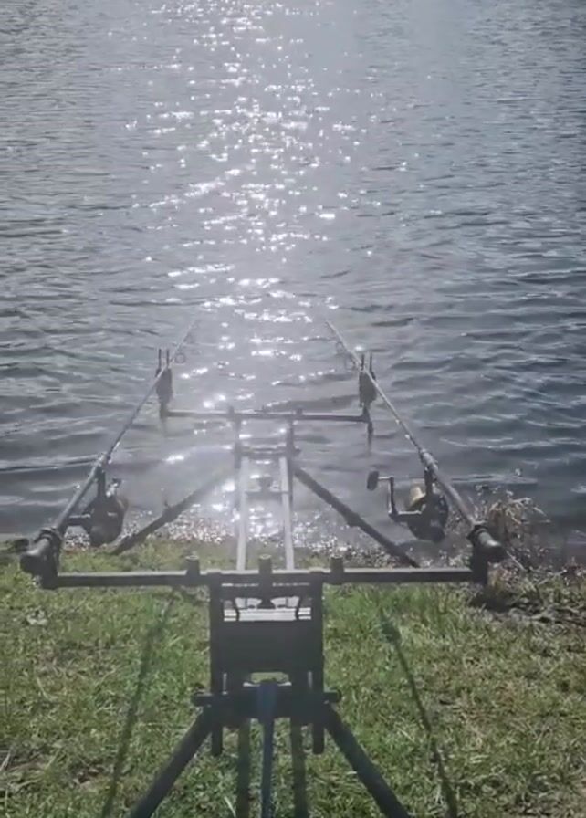 fishing setup on the bank of a lake or pond. Two fishing rods are set up on a tripod rod stand. The rods are aimed towards the shimmering, sunlit water. The bank is covered in green grass. In the background, trees line the opposite shore. The scene is bright and outdoors.