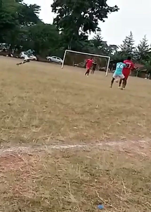 soccer game in progress. The game is being played on a dry grassy field with several trees in the background. The players are wearing red and green jerseys. A white soccer goal is visible in the middle of the field. A yellow-shirted referee is also visible. The players are actively running and kicking the ball. There are a couple of cars and some small buildings visible in the background.