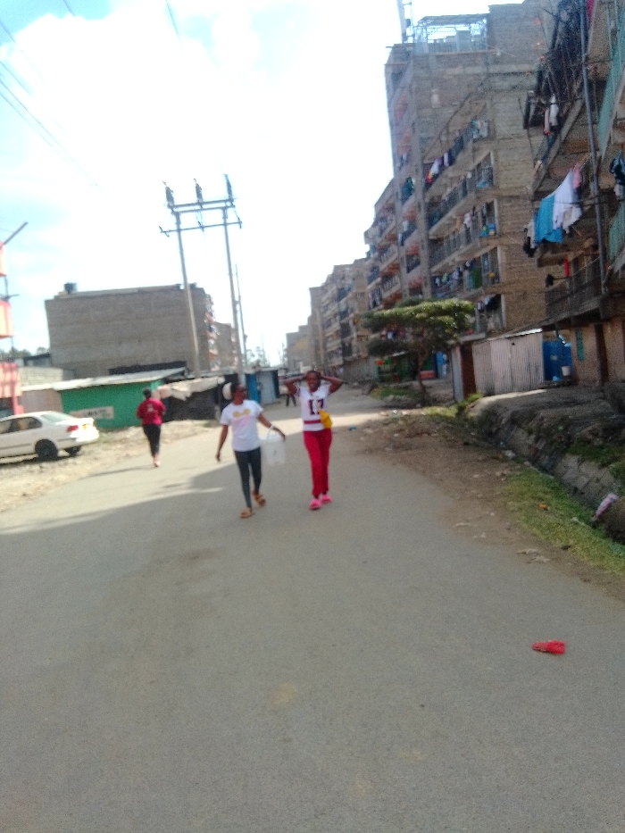The image captures an outdoor urban street scene in Nairobi, Kenya, under bright daylight conditions. An asphalt road, gray in color, traverses the foreground and extends into the background. Three individuals are present on the road. In the immediate foreground, two females walk towards the camera, slightly to the left of the frame's center. The female on the right wears a white top with the numeral "17" visible, red trousers, and pink sandals; her hands are positioned near her head, and a yellow pouch is attached to her left hip. The female to her left wears a white t-shirt, dark trousers, and light-brown open-toed footwear; she carries a translucent plastic bag in her right hand. Further back on the left side of the road, a third female walks away from the camera, dressed in a dark red top and dark trousers. No direct interaction is observed between the individuals. On the left side of the road, a white sedan is parked, partially obscured by a single-story building with a green roof structure. Behind this, a multi-story concrete building with a dark water tank on its roof is visible. A utility pole, featuring multiple crossarms and insulators, supports overhead power lines further down the left side. The right side of the scene is dominated by a continuous row of multi-story residential buildings, constructed from light-colored concrete blocks. Numerous balconies on these buildings display various articles of clothing hanging to dry. Corrugated metal fencing sections are present at the base of some buildings. A small tree with green foliage is situated near the road on the right. A concrete drainage ditch runs parallel to the road on the right, containing some debris. A solitary red plastic object lies on the asphalt in the lower right foreground. The sky above is bright with some cloud cover.