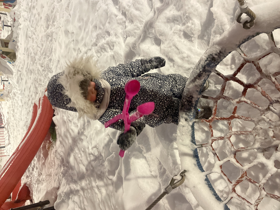 A young child, dressed in a dark blue and white patterned hooded snowsuit with a light-colored faux fur trim and neck warmer, stands amidst deep snow in a children's playground in Moscow, Russia. The child wears dark gloves and holds a bright pink plastic snow-making clip in their right hand, looking downwards. The scene is illuminated by artificial light, indicating nighttime or late evening. The ground is entirely covered in thick, fresh snow. In the immediate foreground, a snow-covered circular web swing with visible blue and red ropes is partially present. In the background, parts of other playground structures, including a red plastic slide, are partially buried in snow. A precise location within Moscow cannot be determined from the image.