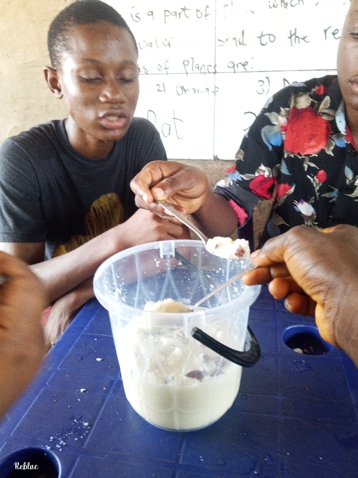 The scene, set in Ukwu-Abwa, Nigeria, depicts three individuals sharing a meal or snack. A young person, possibly male, is positioned on the left, wearing a dark grey t-shirt, with eyes closed or looking down, and mouth slightly ajar. Their left hand holds a spoon, actively scooping from a clear plastic bucket. To their right, a second individual, wearing a black shirt with red, blue, and white floral patterns, uses their left hand to scoop the contents of the bucket with a spoon, which currently holds a portion of the food. In the immediate right foreground, a third, dark-skinned hand also holds a spoon, scooping from the same bucket. The central object is a transparent plastic bucket with a black handle, containing a white, semi-liquid substance mixed with darker, possibly reddish-brown, particulate matter. This bucket rests on a blue plastic table with a textured surface, upon which scattered white specks are visible. The background consists of a light-colored, possibly unpainted wall, to which a white panel or whiteboard is affixed. Handwritten text in black marker is visible on this board, including phrases such as "is a part of," "water," "es of planes are:", "2) Orange," and "Bat," suggesting an educational or informal instructional setting. The individuals are engaged in communal eating using spoons from a shared container.