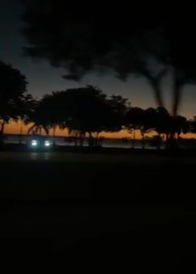 The video is a dark and blurry roadside view at dusk or dawn. The sky transitions from dark blue at the top to a warm orange glow at the horizon. Silhouettes of trees, including palm trees, line the horizon, separating the sky from what appears to be a body of water. Headlights of a vehicle are visible in the distance behind the trees. The foreground is dark, possibly a roadside area, and there are indistinct vertical elements that could be poles or parts of the recording equipment.
