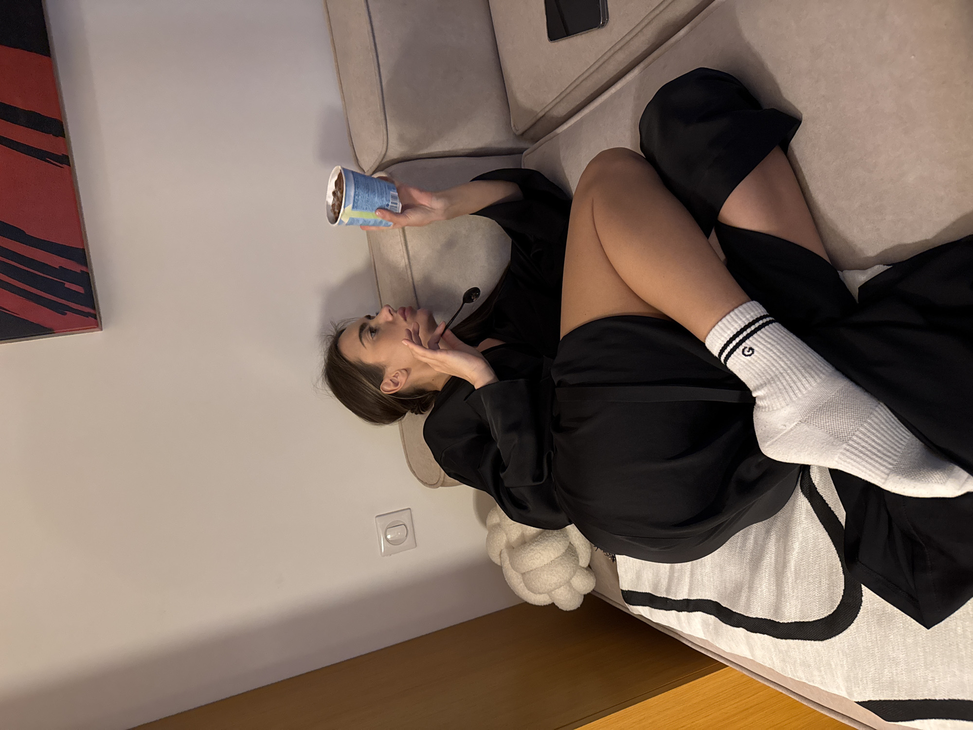 A young woman lies on a beige sofa, angled to the right. She wears a black robe over a black dress and white socks with black stripes. She holds a blue container of what appears to be ice cream in her right hand and a black spoon in her left. The woman is looking up at the container. A black smartphone is to her left on the sofa. A fluffy white decorative pillow is near the sofa’s edge. The sofa has a black and white patterned throw. Behind the sofa is a light beige wall with an electrical outlet and an abstract painting with red and black brushstrokes. A wooden surface is visible in the bottom right corner. This scene likely takes place indoors in a private residence, but there is insufficient information to determine its location in Warsaw, Poland.