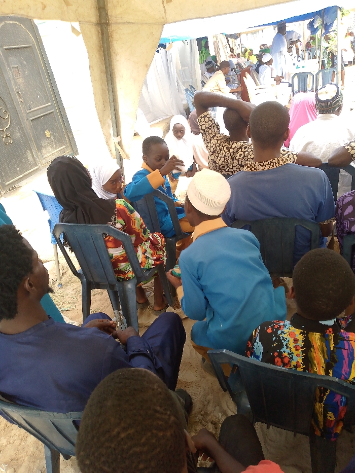 A gathering under a tent shows people seated in plastic chairs. Many are in traditional Islamic attire, including headscarves and kufis. A child is drinking from a small cup. A variety of colorful clothing patterns are visible. A closed gate is on the left. The setting appears to be outdoors, with sand visible on the ground. The atmosphere seems relaxed and communal.