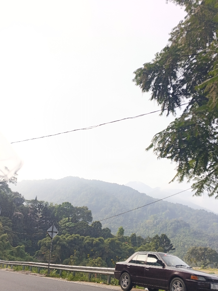 A maroon car is parked roadside against a mountainous backdrop. Green foliage covers the hills, receding into a hazy distance. A road sign stands near a metal barrier along the road's edge. Tree branches partially obscure the upper right corner of the frame. Overhead, power lines stretch across the sky. The day appears overcast and bright.