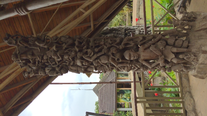 A tall, intricately carved dark brown wooden pillar stands on a rough stone base in the foreground, positioned beneath a visible light-colored wooden roof structure with exposed beams and slats