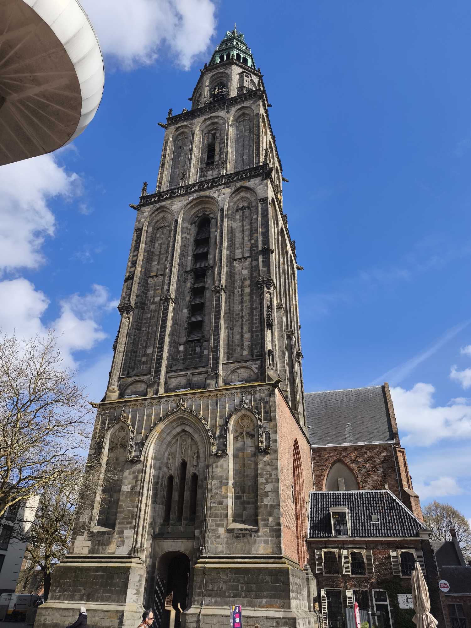 The image displays the Martinitoren (Martini Tower) and a portion of the Martini Church in Groningen, Netherlands, under a bright blue sky with scattered white cumulus clouds. The Martinitoren, a tall, multi-tiered Gothic structure constructed from dark grey stone, occupies the central and upper frame. It features numerous arched windows, architectural detailing, and projecting gargoyles, culminating in a green-patinated spire. To the right of the tower, a section of the Martini Church is visible, characterized by its red brick facade and dark slate roof. Connected to the church, a smaller historical brick building with a dark tiled roof, dormer windows, and white shutters is present on the lower right. On the left side of the frame, a bare deciduous tree with a dense network of branches is visible. In the upper left corner, a large, curved white architectural element partially intrudes into the frame. At the base of the tower, two individuals are partially visible. One person with grey hair is seen from behind on the lower left. Another person with dark hair and a patterned jacket is observed entering the frame from the bottom, facing right. A folded, cream-colored outdoor umbrella is positioned on the far right. A street sign with purple graphic elements is partially visible on the lower left. A faint contrail streaks across the sky in the upper right quadrant. The scene is illuminated by direct sunlight.