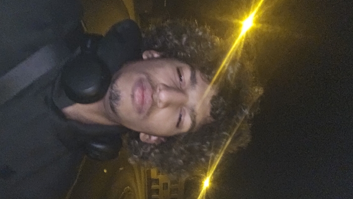 A dimly lit, close-up shot features a man with curly hair. He wears headphones and is angled towards the camera. A light source casts a bright glare near his hair. Background elements are indistinct, appearing to be urban features like buildings.
