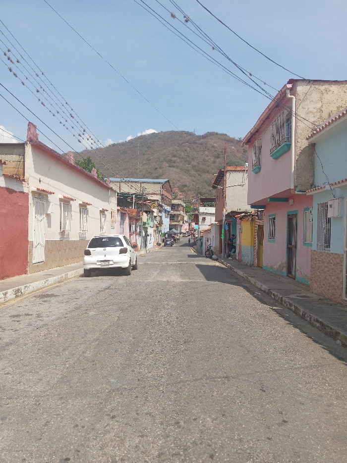 A sunny day scene shows a quiet street in a small town. Colorful, modest houses line both sides of the road, leading up to a distant, brown mountain. A white car is parked on the left, and some other vehicles are visible further up the road. Power lines crisscross the sky above the buildings. The road surface is weathered asphalt.