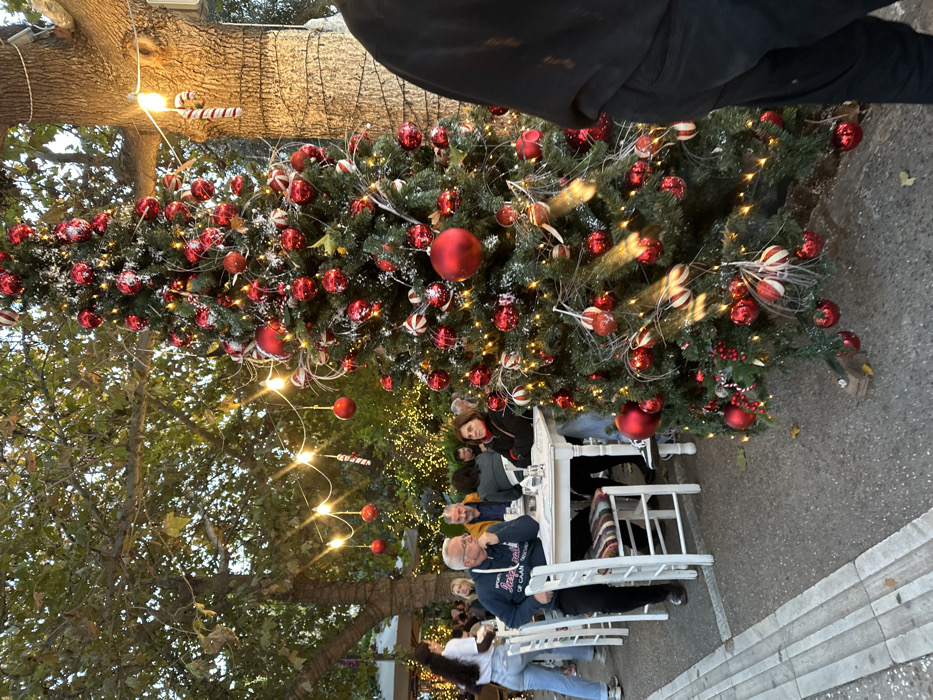 The image captures an outdoor dining or cafe setting in Athens, Greece, illuminated during what appears to be late afternoon or early evening. A prominent, tall artificial Christmas tree dominates the right midground, heavily decorated with numerous glossy red spherical ornaments, red and white striped candy cane ornaments, and strings of warm white fairy lights. The tree's base rests on a small wooden support block on the paved ground. Overhead, string lights with individual bulbs, interspersed with red spherical ornaments and candy canes, are strung between large, mature trees featuring green foliage, some branches appearing bare. In the left midground, several individuals are seated at white rectangular tables with white wooden chairs. A male subject with short grey hair and spectacles, wearing a blue hooded sweatshirt with text, is seated, resting his chin on his right hand, looking towards the right. Opposite him, a female subject with dark hair, wearing a black jacket, is seated, looking towards the left. A male subject with a beard, wearing a yellow jacket, is partially visible behind the first male. Table settings including glasses and plates are present. To the far left, a female subject with long dark hair, wearing a white t-shirt and blue jeans, stands near another white table. The far right foreground shows the partial back and shoulder of an individual wearing a black garment. The ground is a mix of patterned grey sidewalk tiles and darker paved asphalt. In the blurred background, additional patrons are visible seated at other outdoor tables, similarly illuminated by string lights. The scene suggests a festive, social atmosphere.