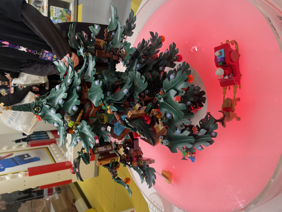An intricately constructed LEGO Christmas tree model stands prominently on a glowing circular pink display platform